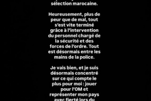 “幸運的是,驚嚇大于傷害,事件在安保人員和執(zhí)法部門的及時介入下迅速平息。目前一切已交由警方處理。我現(xiàn)在很好,也已將注意力重新放在最重要的事情上:為馬賽效力,并在即將到來的國家隊集訓(xùn)中自豪地代表祖國出戰(zhàn)。”