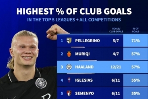 體育資訊10月7日訊 德國(guó)轉(zhuǎn)會(huì)市場(chǎng)統(tǒng)計(jì)了本賽季五大聯(lián)賽球員進(jìn)球占比,哈蘭德攻入曼城57%的進(jìn)球,占比并列第二高,姆巴佩54%、凱恩47%。