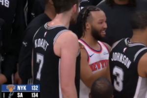 體育資訊01月01日訊 在今日尼克斯不敵馬刺的最后時(shí)刻,尼克斯落后5分,布倫森投進(jìn)了一個(gè)超高難度的壓哨三分球,最終憾負(fù)2分。