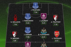 中場:布魯克斯(伯恩茅斯,7.89分)、加納(埃弗頓,9.80分)、吉馬良斯(紐卡斯?fàn)枺?.65分)、特羅薩德(阿森納,8.93分)